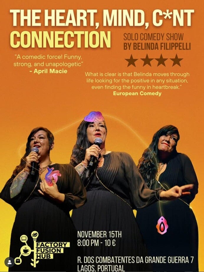 Belinda Filippelli’s debut solo show is a fearless, funny, and deeply personal ride through sex, grief, family chaos, and survival. With her razor-sharp New York voice and unapologetic honesty, Belinda turns trauma into laughter therapy inviting the audience to heal right along with her. From vibrator malfunctions to funeral absurdities to the trials of dating over 40, The Heart Mind C*nt Connection proves there’s nothing we can’t laugh about. After selling out as Work-In-Progress in Prague, Barcelona, Tarragona, Luxembourg and Vienna - The Heart, Mind, C*nt Connection will be showing exclusively at the wonderful community and arts center of Lagos, Factory Fusion Hub so don’t miss out!